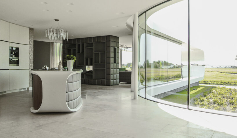 this residential property in the netherlands has been designed to comply with strict regulations that limit the height of the single storey structure. completed by koen olthuis of dutch architecture practice waterstudio.nl, the property utilizes additional floor space at a subterranean level, providing extra surface within the limited dimensions of the building envelope.